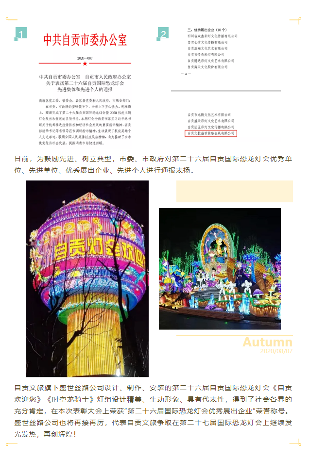 盛世絲路公司榮獲“第二十六屆自貢國(guó)際恐龍燈會(huì)優(yōu)秀展出企業(yè)”榮譽(yù)稱號(hào)
