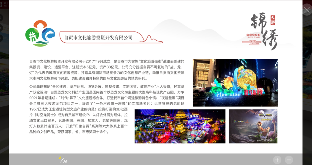 ? ? 自貢文旅投作為我市唯一一家參展企業(yè),繼去年參展獲得多方好評(píng)后,今年再次受邀參加了此次博覽會(huì)四川展廳的云上展示。