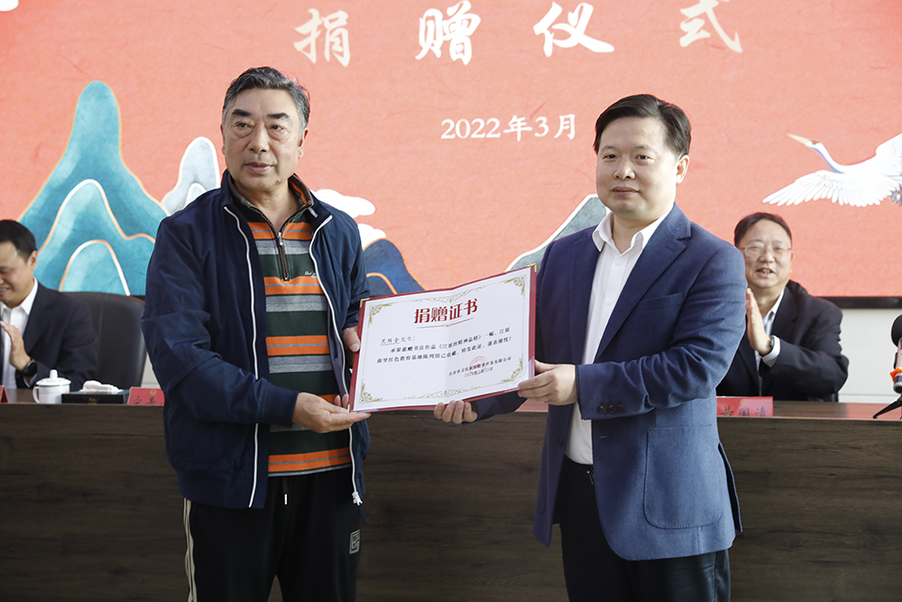 儀式上,范紹全將書法作品《江姐的精神品格》交到了自貢文旅投董事長(zhǎng)宋青山的手中 。他表示,自貢歷史悠久、人才輩出,涌現(xiàn)出了一大批以江竹筠、吳玉章為代表的革命志士,為新中國(guó)成立作出了杰出貢獻(xiàn),我們要永遠(yuǎn)銘記革命先輩精神,讓紅色基因代代相傳。