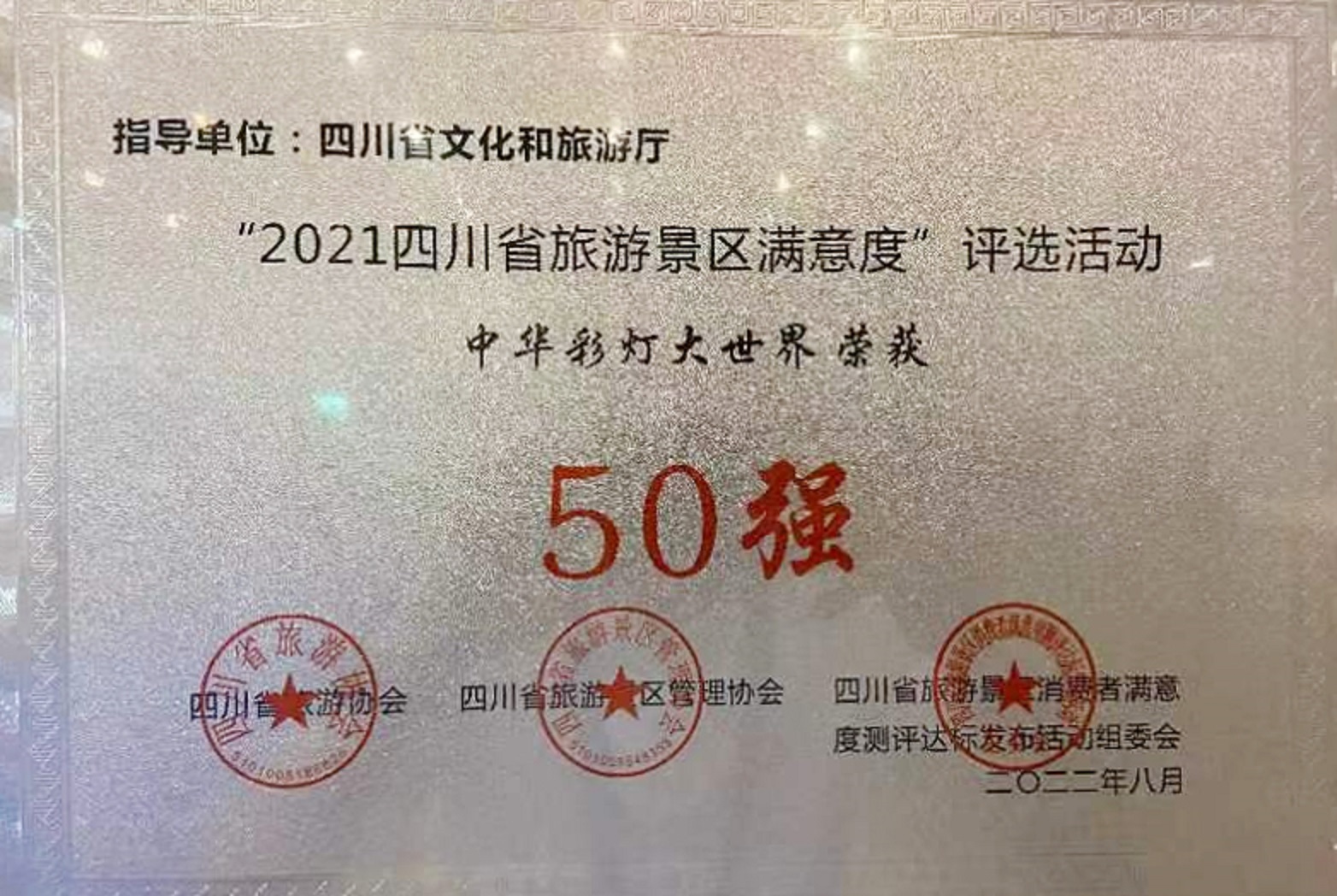 8月26日,第五屆中國(成都)旅游景區(qū)創(chuàng)新發(fā)展博覽會(huì)在成都世紀(jì)城新會(huì)展中心開幕。開幕儀式上,舉行了“2021四川省旅游景區(qū)滿意度”評(píng)選活動(dòng)頒獎(jiǎng)典禮,自貢·中華彩燈大世界榮獲全川旅游景區(qū)滿意度50強(qiáng)。
