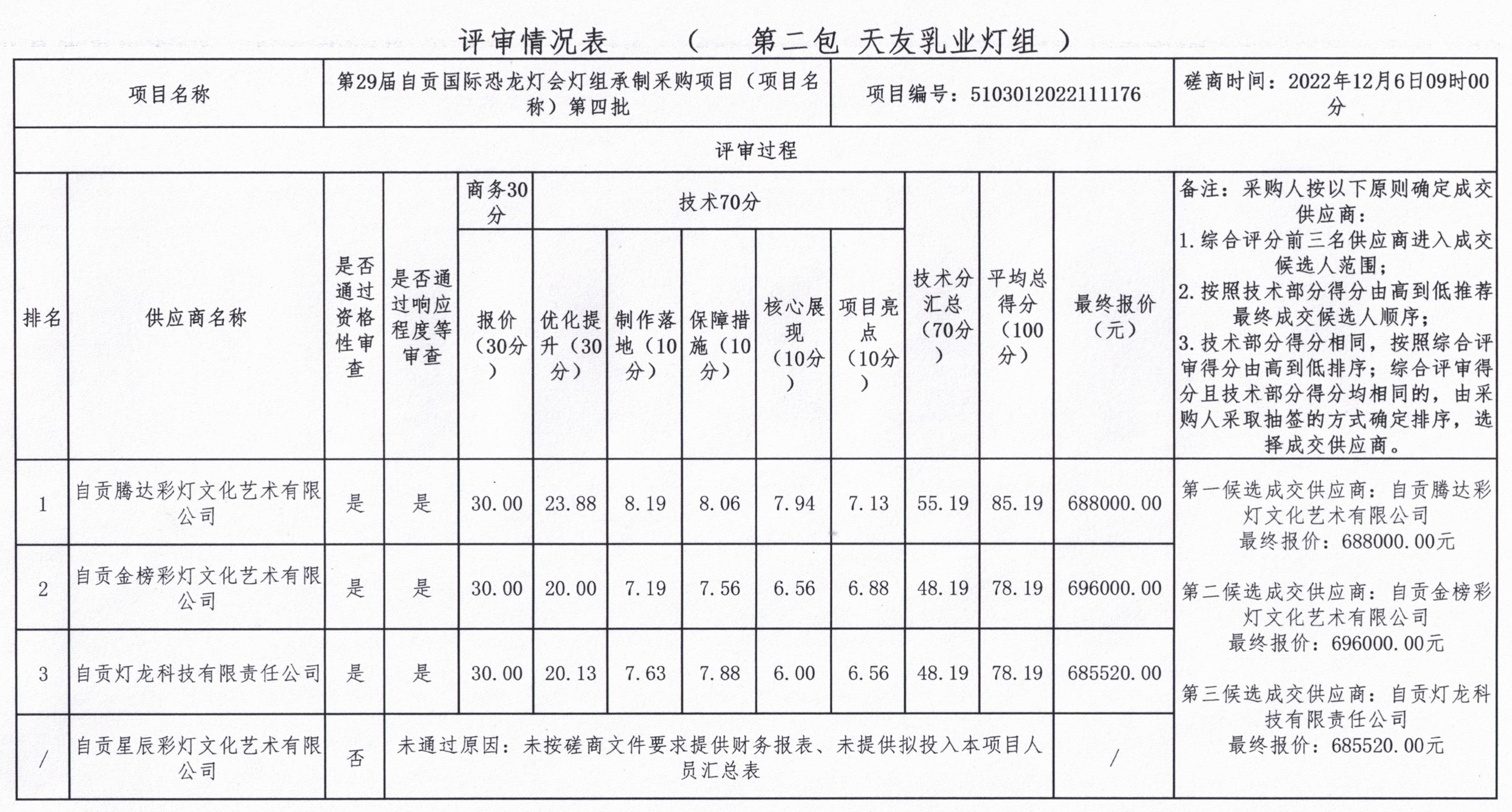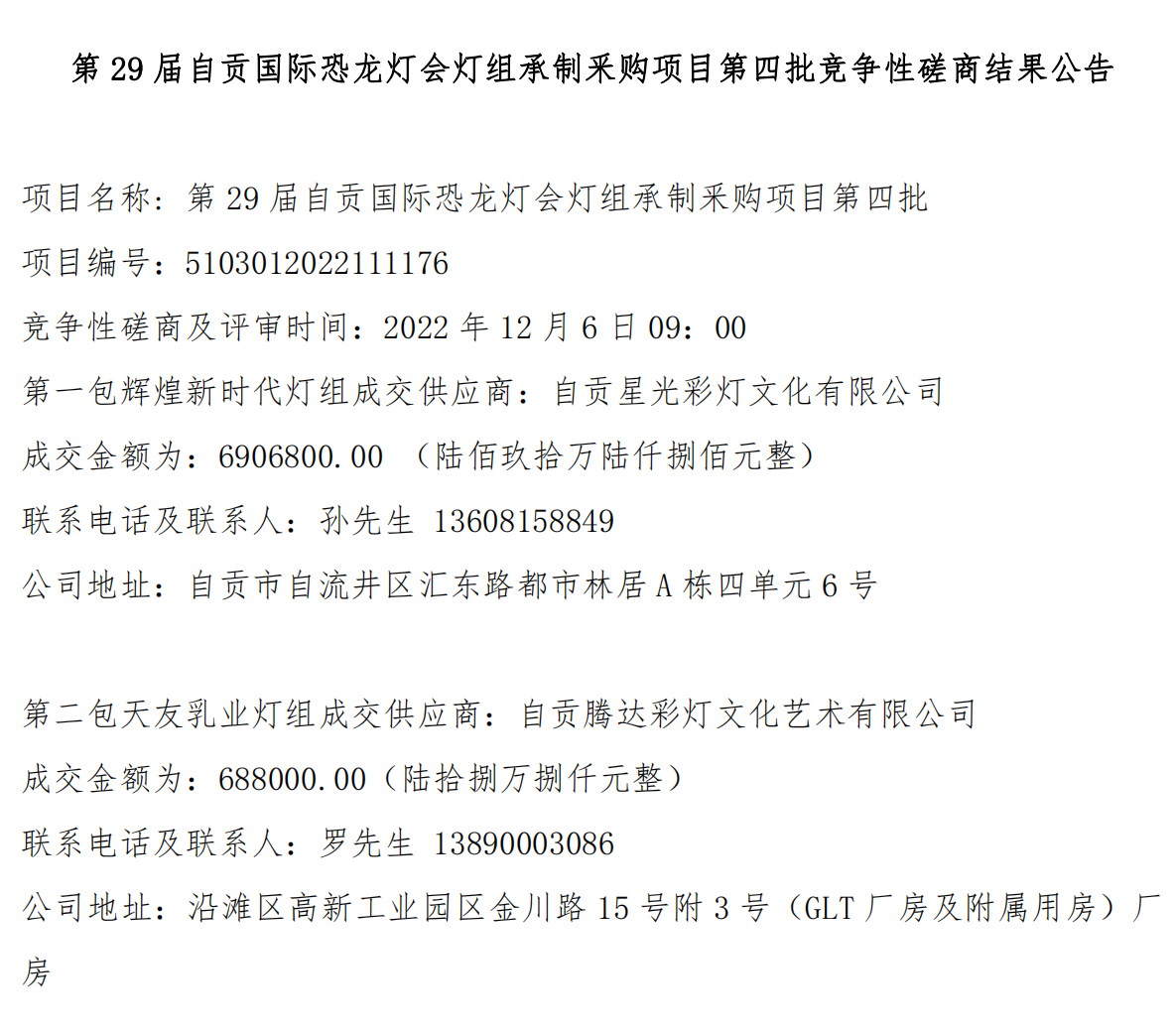第29屆自貢國際恐龍燈會燈組承制釆購項(xiàng)目(項(xiàng)目名稱)第四批競爭性磋商結(jié)果公告