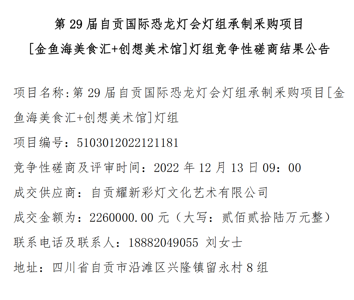 第29屆自貢國際恐龍燈會(huì)燈組承制釆購項(xiàng)目(項(xiàng)目名稱)[金魚海美食匯+創(chuàng)想美術(shù)館]燈組競(jìng)爭(zhēng)性磋商結(jié)果公告