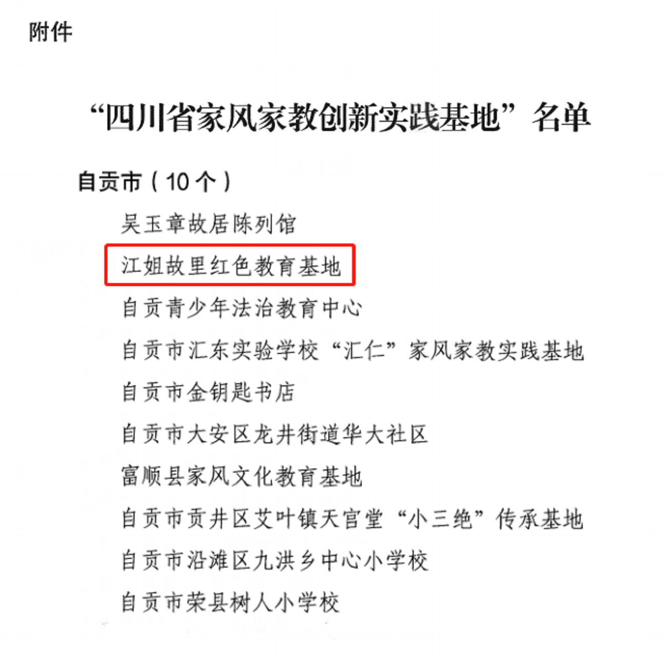 近日,省婦聯(lián)、省教育廳發(fā)文命名了一批“四川省家風(fēng)家教創(chuàng)新實踐基地”,由自貢文旅投公司運營管理的江姐故里紅色教育基地成功上榜。