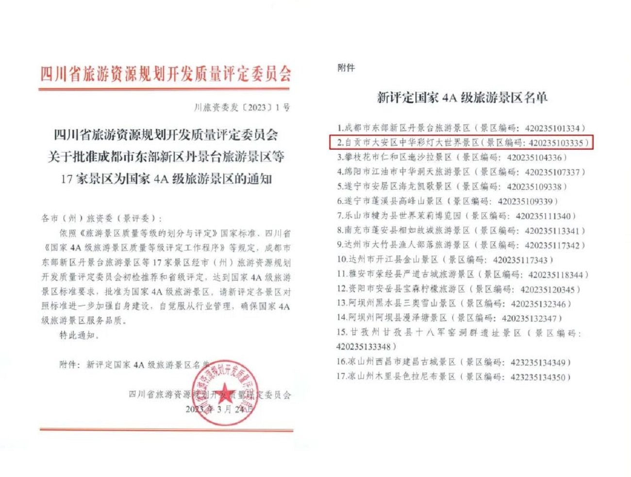 3月24日,四川省旅游資源規(guī)劃開發(fā)質(zhì)量評定委員會公布了最新一批我省國家4A級旅游景區(qū)名單,根據(jù)《旅游景區(qū)質(zhì)量等級的劃分與評定》和《旅游景區(qū)質(zhì)量等級管理辦法》國家標(biāo)準(zhǔn),經(jīng)市(州)旅資委(景評委)初檢推薦和省級評定,確定中華彩燈大世界等17家旅游景區(qū)為國家4A級旅游景區(qū)。