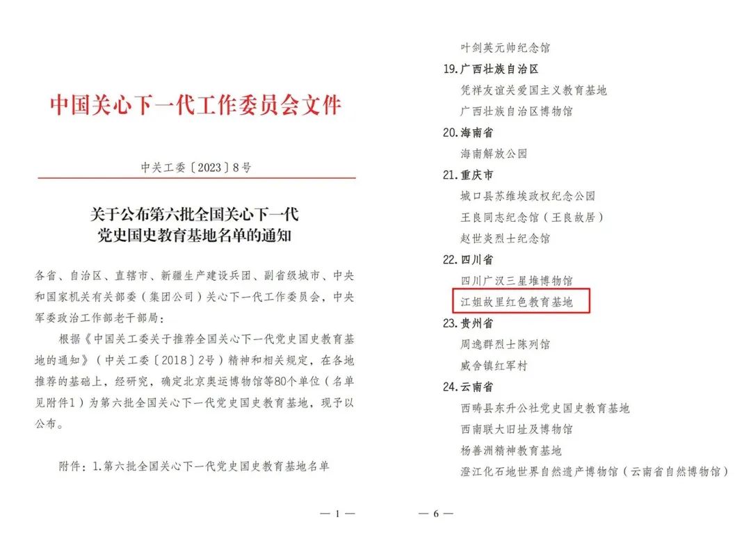 5月30日,在各地推薦的基礎(chǔ)上,經(jīng)過層層篩選,中國關(guān)心下一代委員會發(fā)布了《關(guān)于公布第六批全國關(guān)心下一代黨史國史教育基地名單的通知》,確定北京奧運博物館等80個單位為“第六批全國關(guān)心下一代黨史國史教育基地”。其中,四川省共2個單位入選,江姐故里紅色教育基地成功上榜。