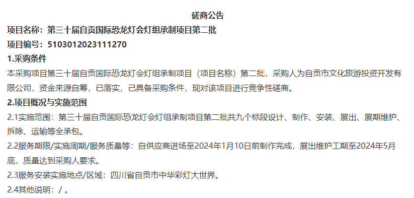 第三十屆自貢國(guó)際恐龍燈會(huì)燈組承制項(xiàng)目第二批競(jìng)爭(zhēng)性磋商采購(gòu)公告
