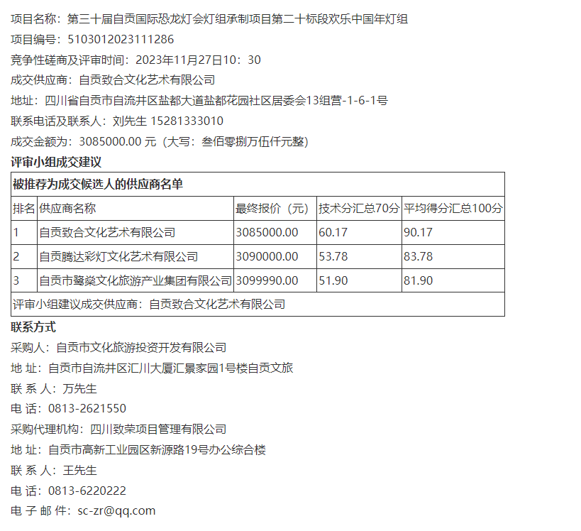 第三十屆自貢國(guó)際恐龍燈會(huì)燈組承制項(xiàng)目第二十標(biāo)段歡樂(lè)中國(guó)年燈組競(jìng)爭(zhēng)性磋商成交公告