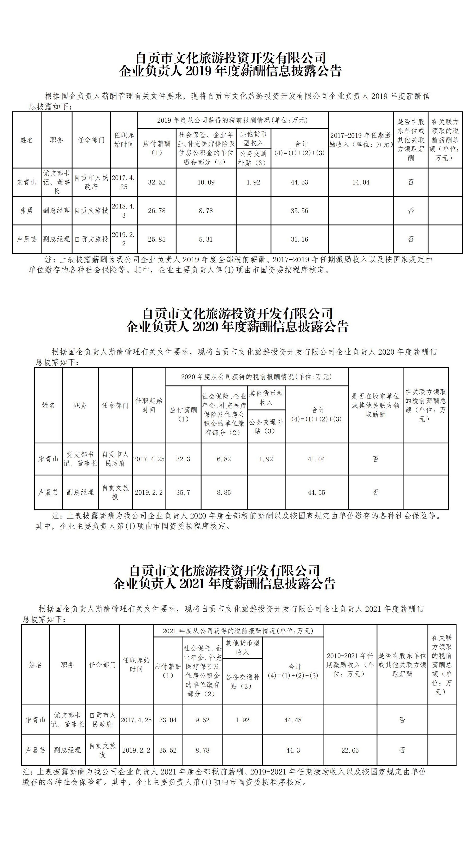 自貢市文化旅游投資開發(fā)有限公司企業(yè)負責(zé)人2019年度至2021年度薪酬信息披露公告
