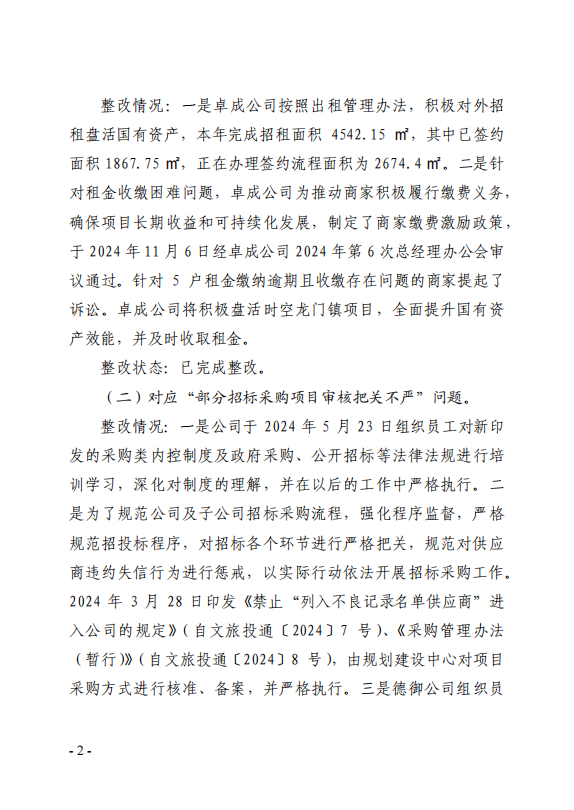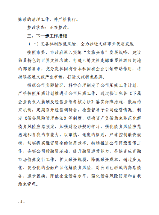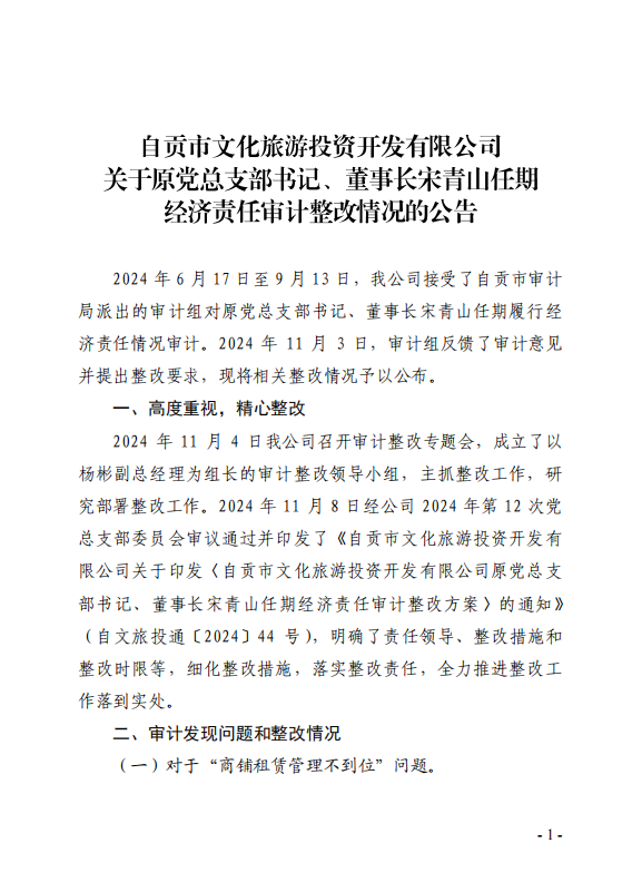 自貢市文化旅游投資開發(fā)有限公司關(guān)于原黨總支部書記、董事長(zhǎng)宋青山任期經(jīng)濟(jì)責(zé)任審計(jì)整改情況的公告