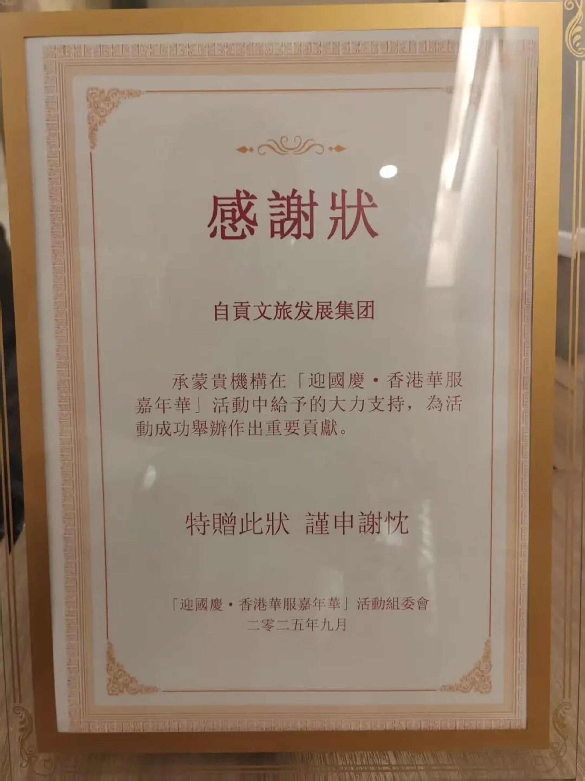活動現(xiàn)場,霍啟剛代表組委會向自貢文旅集團頒發(fā)感謝狀。自貢文旅集團表示將持續(xù)發(fā)力——自貢彩燈承載千年文化底蘊,凝聚無數(shù)工匠心血,既是藝術(shù)瑰寶,也是文化交流使者。此次華服彩燈嘉年華,愿為廣大香港市民呈現(xiàn)最優(yōu)的中華彩燈作品,傳遞中華優(yōu)秀傳統(tǒng)文化魅力!