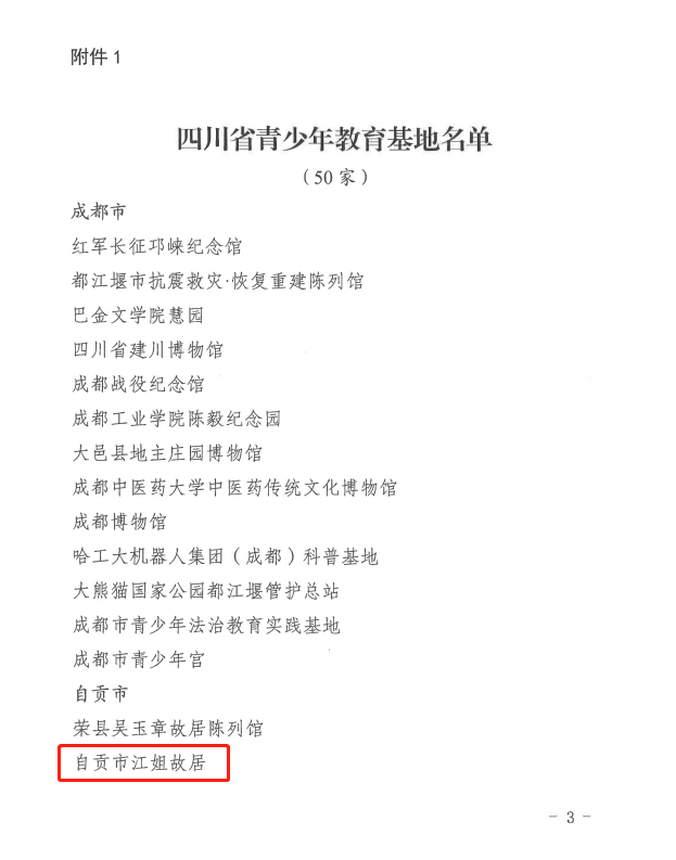5月30日,在各地推薦的基礎(chǔ)上,經(jīng)過(guò)層層篩選,中國(guó)關(guān)心下一代委員會(huì)發(fā)布了《關(guān)于公布第六批全國(guó)關(guān)心下一代黨史國(guó)史教育基地名單的通知》,確定北京奧運(yùn)博物館等80個(gè)單位為“第六批全國(guó)關(guān)心下一代黨史國(guó)史教育基地”。其中,四川省共2個(gè)單位入選,江姐故里紅色教育基地成功上榜。